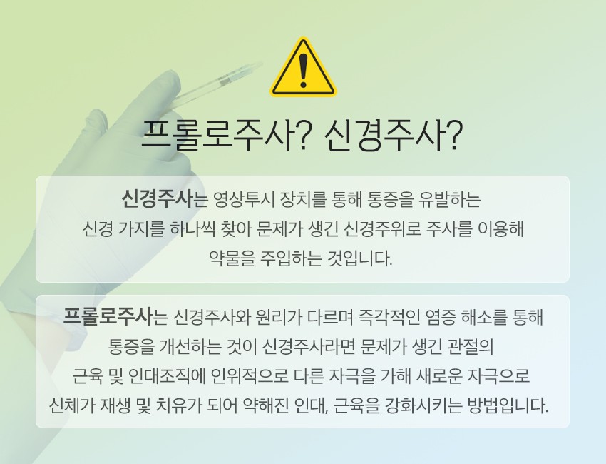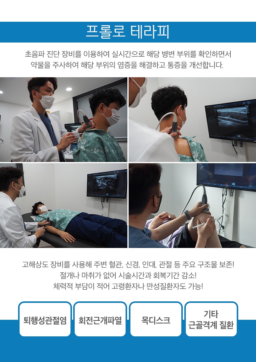 프롤로주사는 고삼투압의 주사액을 주입해 통증을 완화하는 비수술적 재생주사요법으로 손상된 인대 및 연골, 연골판 등에 주사하게 되면 염증이 생긴 부위가 자극을 받으면서 세포가 증식되고 손상된 부위를 강화합니다.